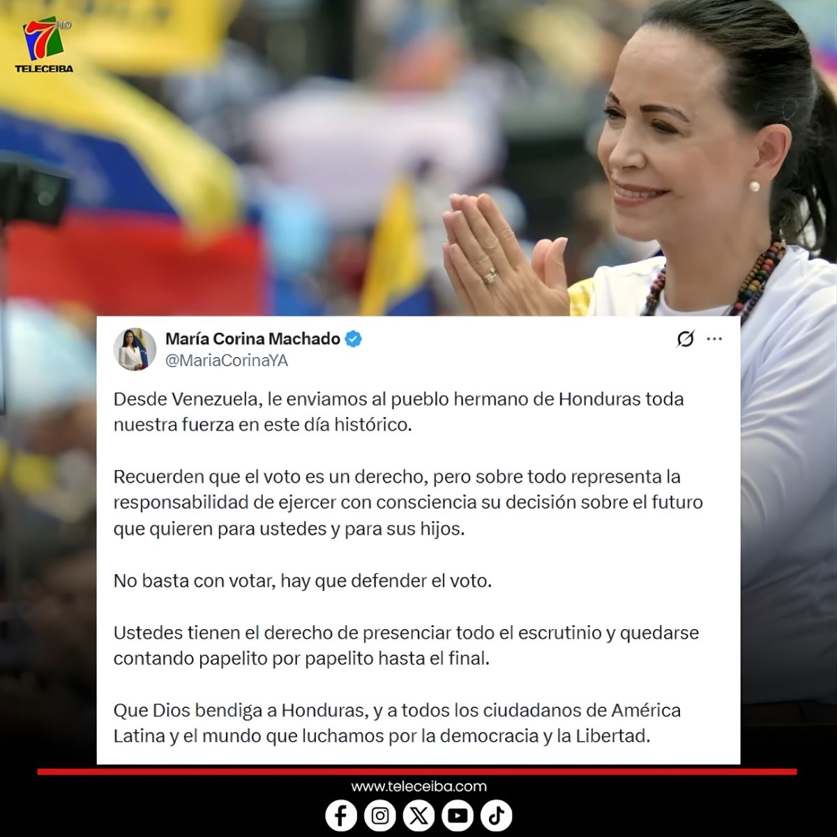 La política venezolana y premio Nobel de la Paz, María Corina Machado, hizo un llamado a los hondureños a defender su voto en las elecciones generales que se celebran en el país.
